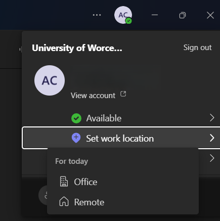 3. Next to your status, choose your work location from the location dropdown menu, which it can be set to either Office or Remote