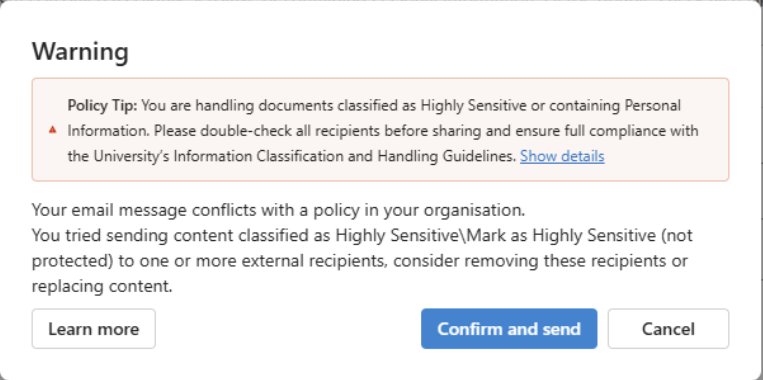 The University has now implemented a feature within Microsoft Outlook where staff will recieve warning prompts requesting confirmation if an attempt is made to send an email that includes documents labelled as sensitive. The prompt will appear like this: